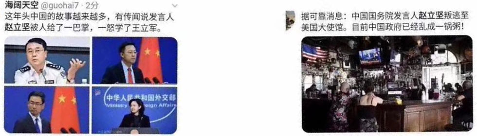 但是也有無從查證的。網上有人在傳,中共外交部發言人趙立堅,因為發推向美國甩鍋惹了大禍,受到上級批評。甚至被華春瑩打了一巴掌,然後一怒之下,帶著絕密文件叛逃美國大使館,成功上演了王立軍2.0。趙立堅的確已經26天沒有露面了,他的隱身自然會引起人們的蜚短流長。這種消息查證需要時間,而且又因為「叛逃說」出現的時間恰好在愚人節,所以我們姑且放一放,觀察一下。