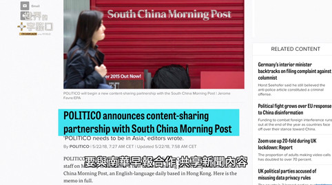 像知名的政治新聞網「政客(Politico)」,2018年宣布政客歐洲分部要與南華早報合作,共享新聞內容,當時就引發廣泛議論,質疑「政客」與中共結盟,會影響他們的報導方向。