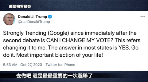 川普在10月27日發推特說:谷歌趨勢顯示,很多人在問能不能改選票,在大多數州是可以的,去做吧。這是最最重要的一次選舉了。
