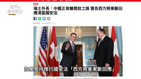 而且別忘了,身為中立國的瑞士日前也罕見主動表態,批評中共「背離開放之路」,如果堅持推行國安法,「西方將會果斷回應」。